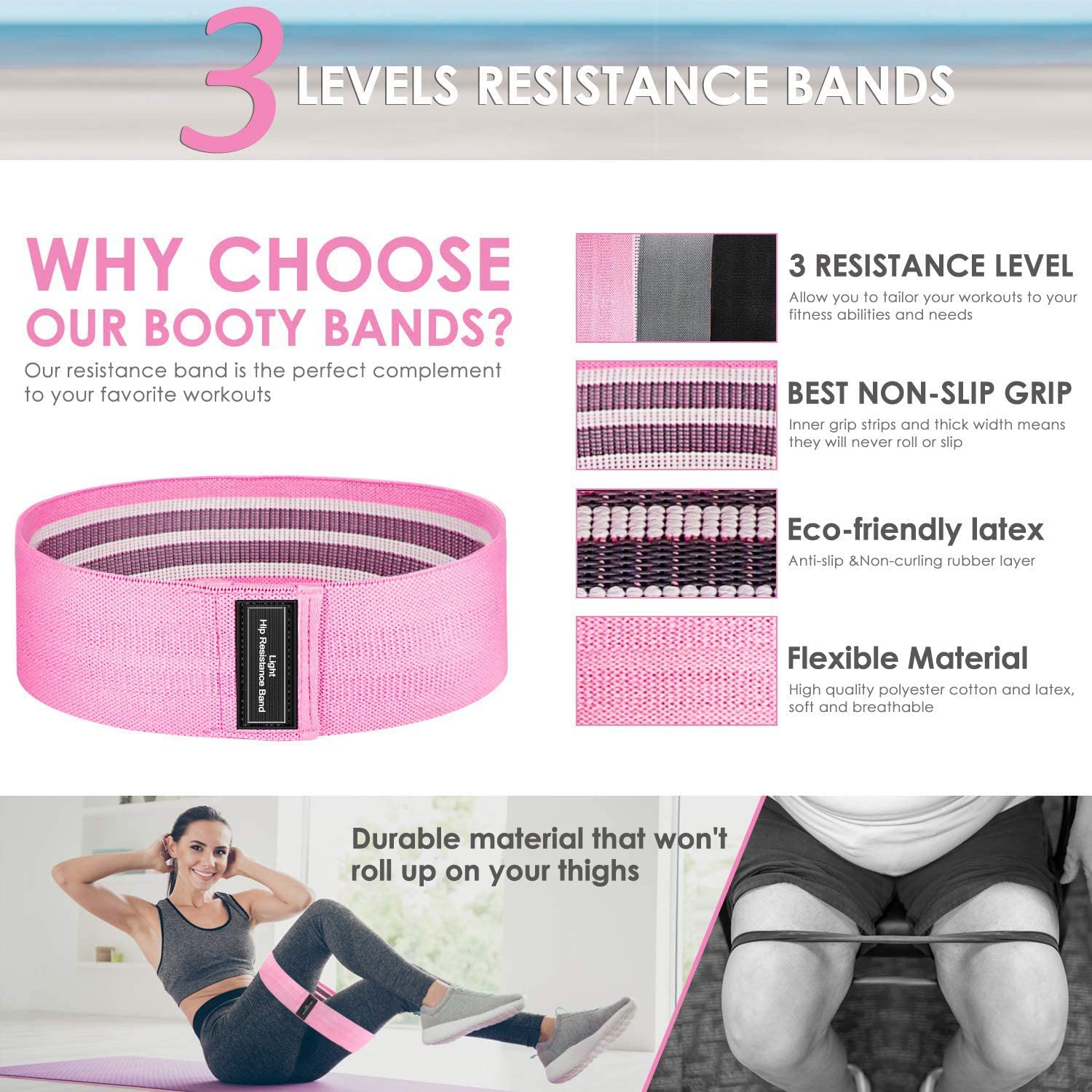 【Resistance Bands Set】 It is 3 different resistance levels of Light, Meduim and Heavy, no worry about the hip bands too stretchy or too big
